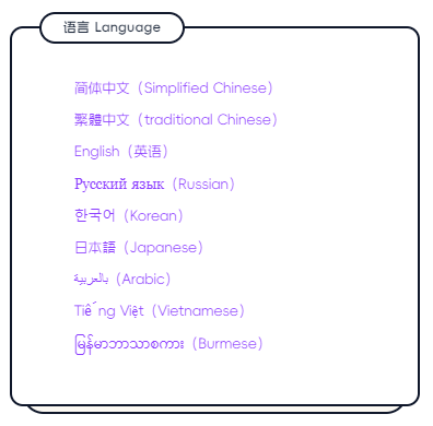 英语、俄语、韩语、日语、阿拉伯语、越南语、缅甸语